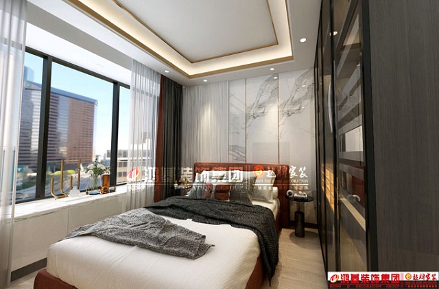 圖5.亮點(diǎn):為避免單調(diào),主臥床頭背景采用護(hù)墻板結(jié)合鈦金條的設(shè)計(jì),頂面吊頂相互呼應(yīng)。